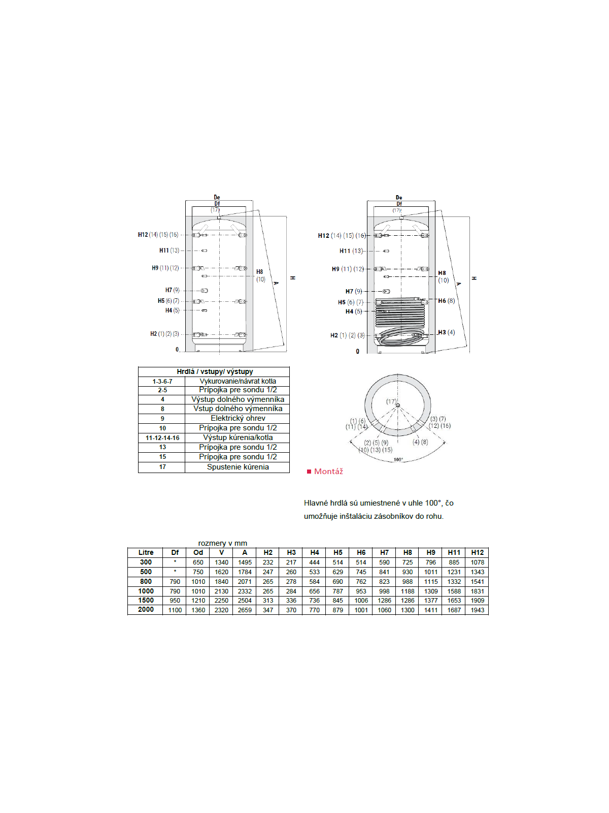 Přípojky: 4×2 hlavní hrdla, 5 přípojek pro sondy a teploměry, přípojka na elektrickou spirálu; hlavní hrdla jsou osazena pod úhlem 100° – umožňují montáž do rohu.